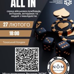 У Тернополі 27 лютого відбудеться дружній турнір зі спортивного покеру “ALL IN” для військовослужбовців, ветеранів та людей з інвалідністю. Подія
