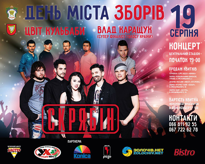 19 серпня в містечку Зборів, що на Тернопільщині, відбудеться грандіозне святкування Дня міста. На центральному стадіоні Зборова відбудеться концерт за участю гуртів “СКРЯБІН”, “Цвіт Кульбаби” та суперфіналіста “Голосу країни” Влада Каращука.