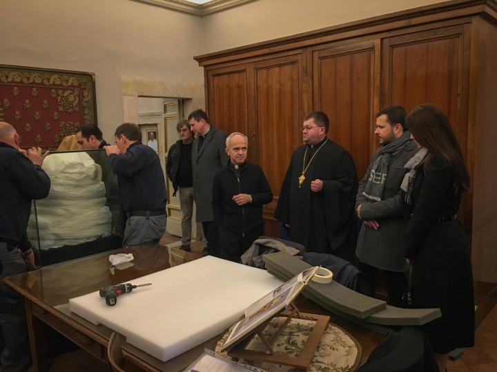 — Ми мали гарну подію, заради якої прибули до Риму, ми прибули з нашою групою з України, до нас долучився семінарист брат Роман Демуш, він навчається в Римі, нас супроводжує. Ми піднялись у Сикстинську капелу, нас зустрів заступник завідателя Папської Захристії, протоієрей Паоло Бенедік, він є відповідальним за папську захристію. Він буде супроводжувати ікону, я буду їхати з ним за цією іконою, щоб забирати її з летовища в Києві. Ми піднялись сьогодні в капелу, де є Захристя, запаковували в спеціальний контейнер Ікону Спаса з Едесси, були представники делегації, отець Паоло Бенедик, представники Папської Захристі, страхової компанії. Нам вручили огригінал договору і страховий поліс, — розповів отець Роман Дутчак.