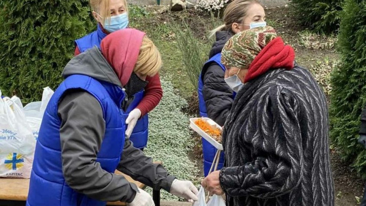 За її словами, працівники благодійної їдальні “Карітасу” роздають своїм підопічним обіди та продуктові набори. У них – олія, крупи, макарони, консерви, овочі.