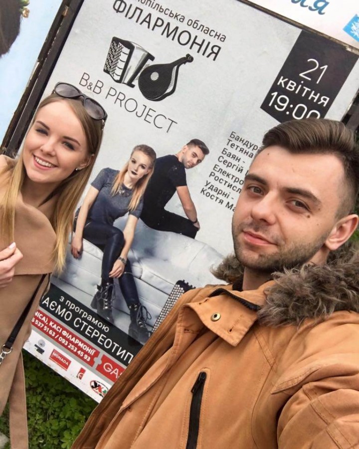 Про цей концерт сміливо можна сказати: “Такого ви ще не бачили!” Адже 21 квітня до Тернополя вперше завітав гурт, який наробив галасу в музичному середовищі по цілій країні!.. Зрештою, що там по країні — вони весь інтернет “на вуха” поставили! Безперечно, “B&B project” — гурт на мільйон! На мільйон… переглядів! Думаєте, хіти від “Metallica” на бандурі з баяном — це неможливо? А як вам класика? Скажімо, “Пори року” Вівальді, виконані у цьому ж складі? “Ми працювали над цією композицією десь півроку, якщо не більше”, — зізнається Сергій. За легкістю їхньої зіграності – насправді колосальна робота… Зате тепер зрозуміло, чому кожне відео із бандуристкою з Херсонщини Тетяною Мазур та уродженцем Запоріжжя баяністом Сергієм Шамраєм, які на своїх інструментах виконують кавери світових хітів, щоразу набирає мільйони переглядів в інтернеті… Зрештою, охочих подивитися та почути їх у Тернополі “вживу” було хоча й не мільйон, проте також немало… А самі Тетяна і Сергій охоче розповіли “НОВІЙ…” про те, як дійшли до такого музикування.