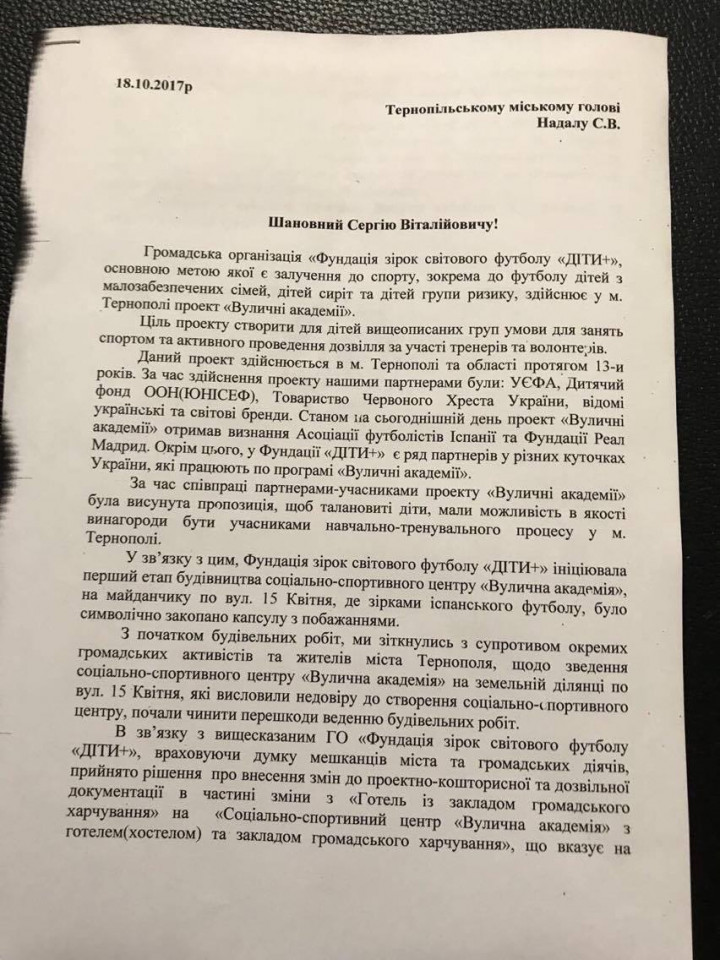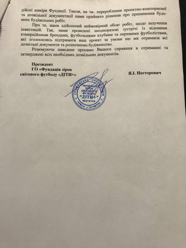 Як пояснює у листі керівник фонду Ярослав Нестерович, організація «Фундація зірок світового футболу «Діти+» працює у Тернополі вже 13 років та опікується УЄФА, Дитячим фондом ООН, Товариством Червоного Хреста та іншими українськими і міжнародними організаціями.
