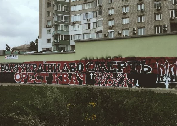 Одна зі стін на проспекті Валерія Лобановського тепер прикрашена написом в честь вболівальника “Динамо” Ореста Квача, який загинув у 2014 році під час війни на Донбасі.