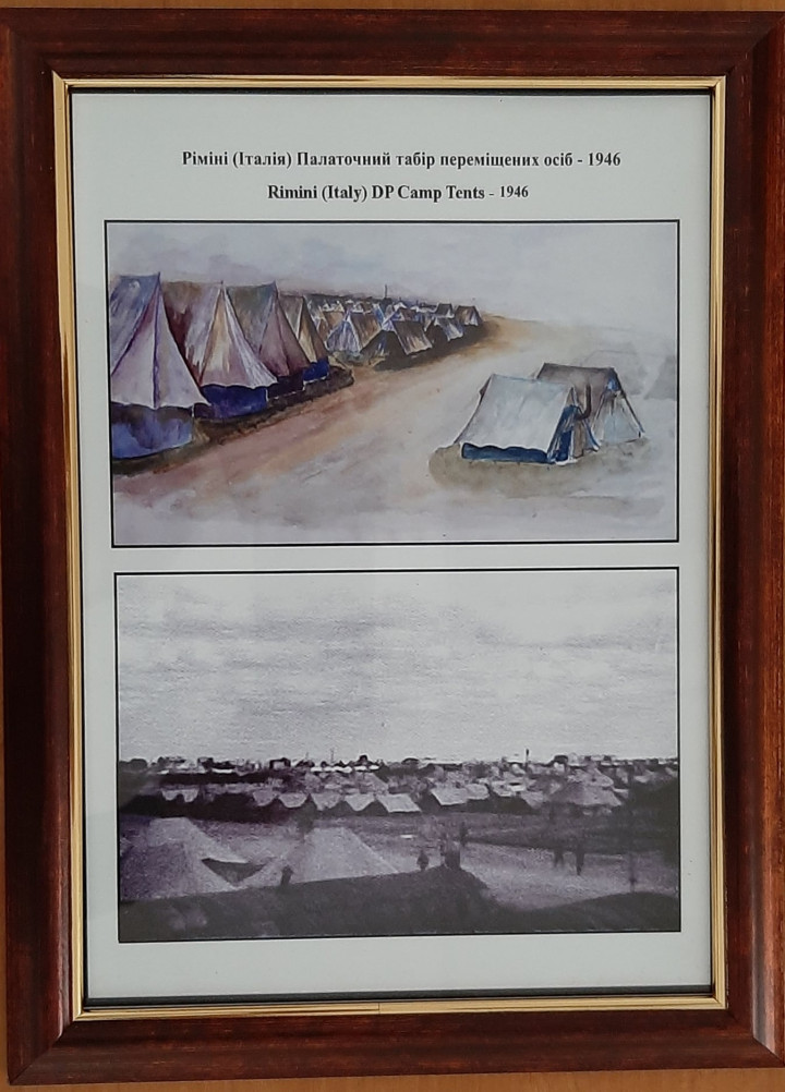 Чохол для бандури, пошитий з полотна, яке використовувалося для виготовлення наметів у таборі DP Ріміні (Італія) та колаж «Ріміні (Італія). Палаточний табір переміщених осіб – 1946» музею у Бережанах передав меценат Мирон Постолан.