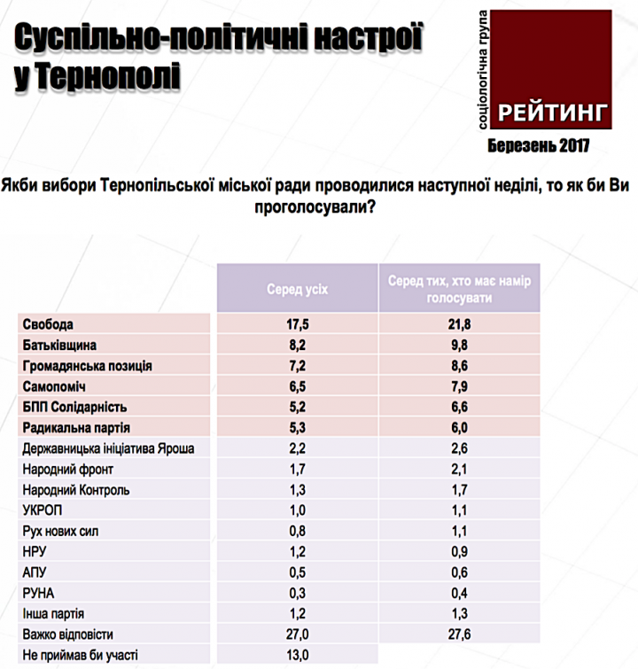 Соціологія говорить, що станом на кінець березня 2017 року рейтинг «Свободи» перевищує 20 %. І це не у виборчий період. ВО «Свобода» у Тернополі відірвалася від решти партій більше ніж 10 %. Такий результат показує, що тернополянам подобається рішучість та принциповість націоналістичної «Свободи».