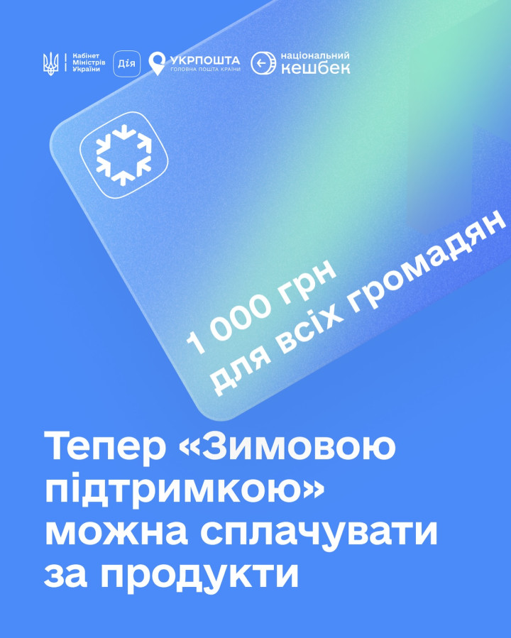 Від 11 грудня 1 000 грн допомоги в межах програми «Зимова підтримка» можна використовувати на купівлю продовольчих товарів українського виробництва (крім підакцизних). Розрахуватися за них можна карткою «Національний кешбек».