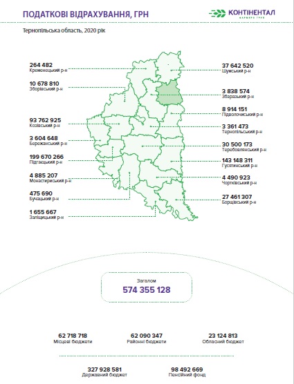 «Контінентал Фармерз Груп» відзвітувала про сплачені у 2020 році податки та реалізовані соціальні проекти. Зокрема, за попередній рік підприємства Компанії, розташовані в Тернопільській обл., сплатили 574,3 млн грн податків. Розмір соціальних інвестицій, які «Контінентал» виділив минулого року населеним пунктам Тернопільщини, перевищив 13,2 млн грн.