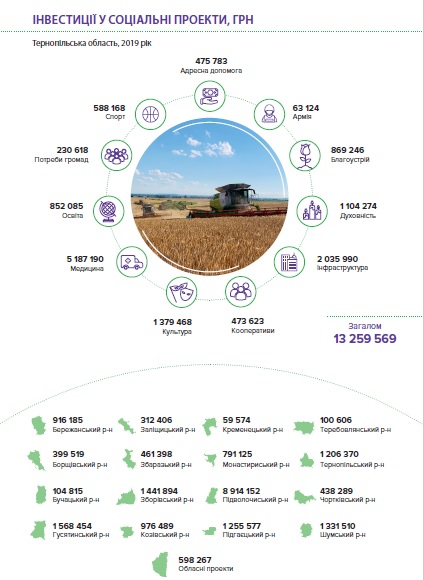 Аграрії приділили увагу й духовним потребам громад. Зокрема, у 2020-му Компанія виділила 1,1 млн грн на фінансову підтримку церков області. На кошти із соціального бюджету вдалося відремонтувати церкви в с. Калинівка Зборівського р-ну, с. Заставці Монастириського р-ну, с. Вага Підгаєцького р-ну, перекрити храм у с. Новосілки Заліщицького р-ну, укріпити мур біля церкви в с. Винятинці, а ще — фінансово підтримати церковні громади в с. Смиківці Тернопільського р-ну, с. Палашівка Чортківського р-ну, с. Вибудів Козівського р-ну.