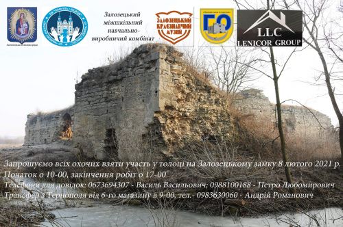 “Шановні жителі Залозеччини та усі не байдужі до збереження культурної спадщини краю! Запрошуємо Вас взяти участь у толоці на Замку. Плануємо розчистити мури та оборонний рів від кущів. Із собою мати пилку, сокиру, рукавички і подбати про теплий одяг і взуття! Гарний настрій і теплий обід гарантуємо. До акції можна долучитися і матеріалами ( масло, бензин, дизпаливо, канапки волонтерам). Також не забуваємо дотримуватися карантинних обмежень! Щиро дякуємо за підтримку. Попереду в планах прибрати і інші об’єкти, в тому числі і старі кладовища на Нових і на Старих Залізцях. Усі питання за зазначеними телефонами, – пишуть у групі Залозецький краєзнавчий музей”.