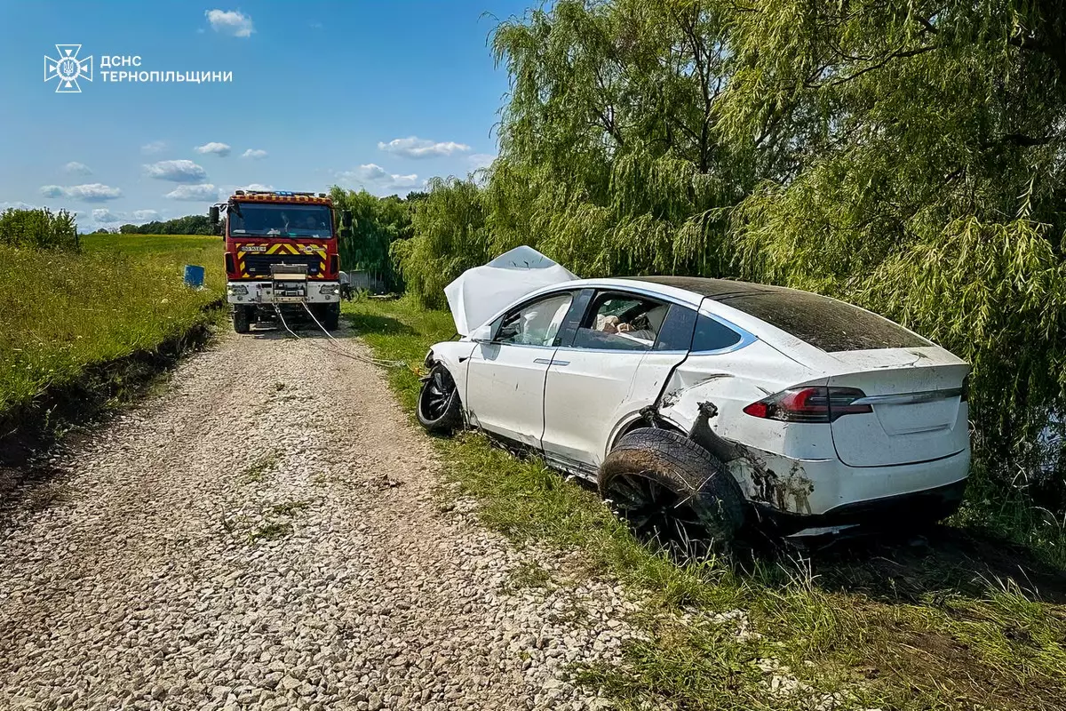У селі Киданці Збаразької територіальної громади Тернопільського району легковий електромобіль Tesla Model X з’їхав у місцевий ставок.