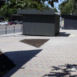 Триває облаштування зупинки громадського транспорту на вул. Київська, 1. Тут працівники підрядної організації вкладають нову тротуарну плитку та бордюр. В