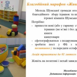 У Шумській громаді проводять благодійний марафон «Живи позитивно». Його ініціювала молодіжна рада Шумської громади. Організатори марафону збирають іграшки та книги,