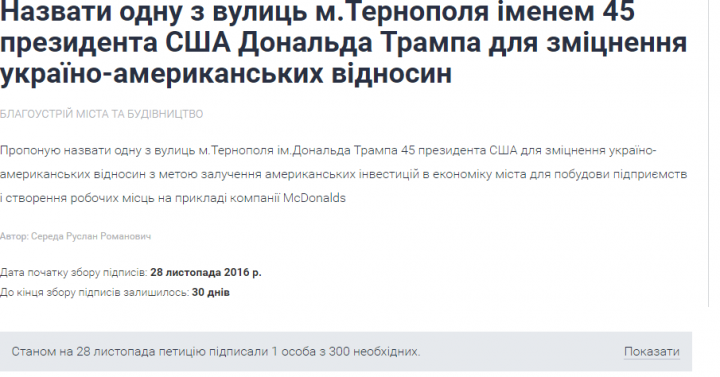 Сьогодні вранці на сайті міської ради тернополянин зареєстрував оригінальну петицію. Місцевий мешканець просить, щоб одну з тернопільських вулиць назвали на честь нового президента США Дональда Трампа.