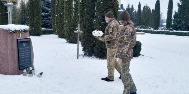 До підніжжя пам’ятника Героїв України у Шумську військові поклали квіти.