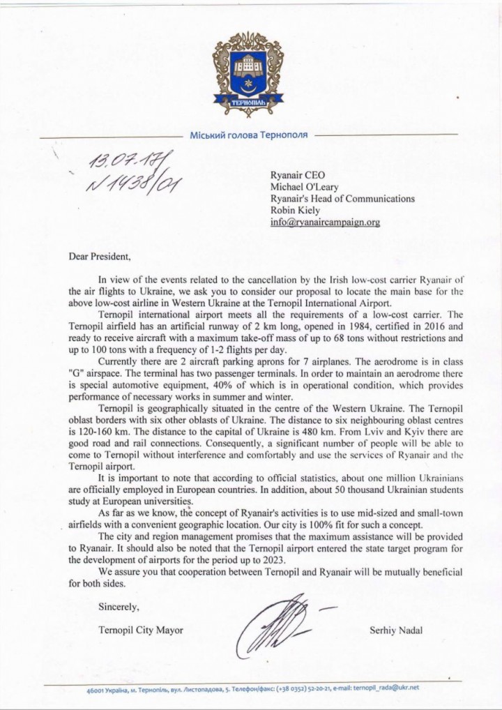 18664272_1442418502445116_7625354268547328449_n-2Міський голова Тернополя Сергій Надал звернувся до керівництва країни та авіакомпанії-лоукостера Ryanair з пропозицію розглянути Міжнародний аеропорт «Тернопіль» як основну базу для лоукостера в Західній Україні.