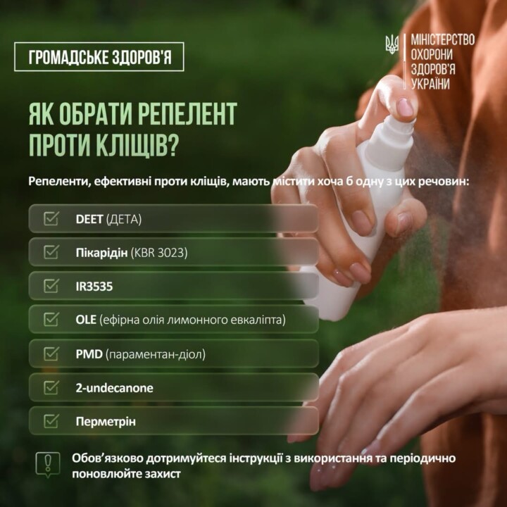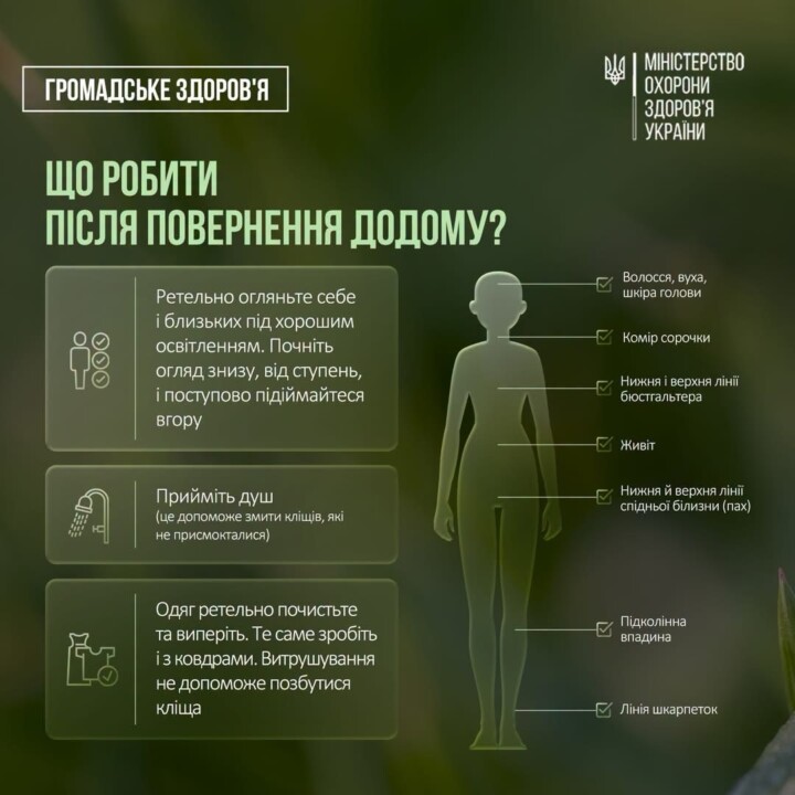 Крім того, не рекомендується сидіти чи лежати на траві, слід використовувати репеленти та кожні дві години прогулянки оглядати себе і близьких.
