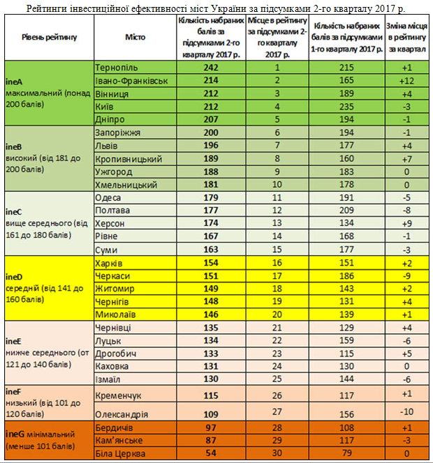За підсумками 1-го кварталу 2017 року, Тернопіль уже демонстрував максимальну інвестиційну ефективність, отримавши 215 балів, проте настільки високого результату, як цього разу, місто досягло вперше.
