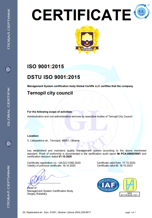 Підтвердженням результативного функціонування системи управління якістю є успішне проходження міською радою ресертифікаційного аудиту 23-24 вересня 2020 року. Проводив аудит міжнародний аудитор сертифікаційного органу «DEKRA» (м. Штудгард, Німеччина).