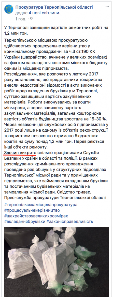 Зокрема у повідомленні Тернопільської прокуратури зазначається, що силами СБУ, поліції та прокуратури викрито “злочин” пов’язаний із завищенням вартості ремонтних робіт у місті Тернополі. Поряд з тим зазначається, що “слідство триває”.