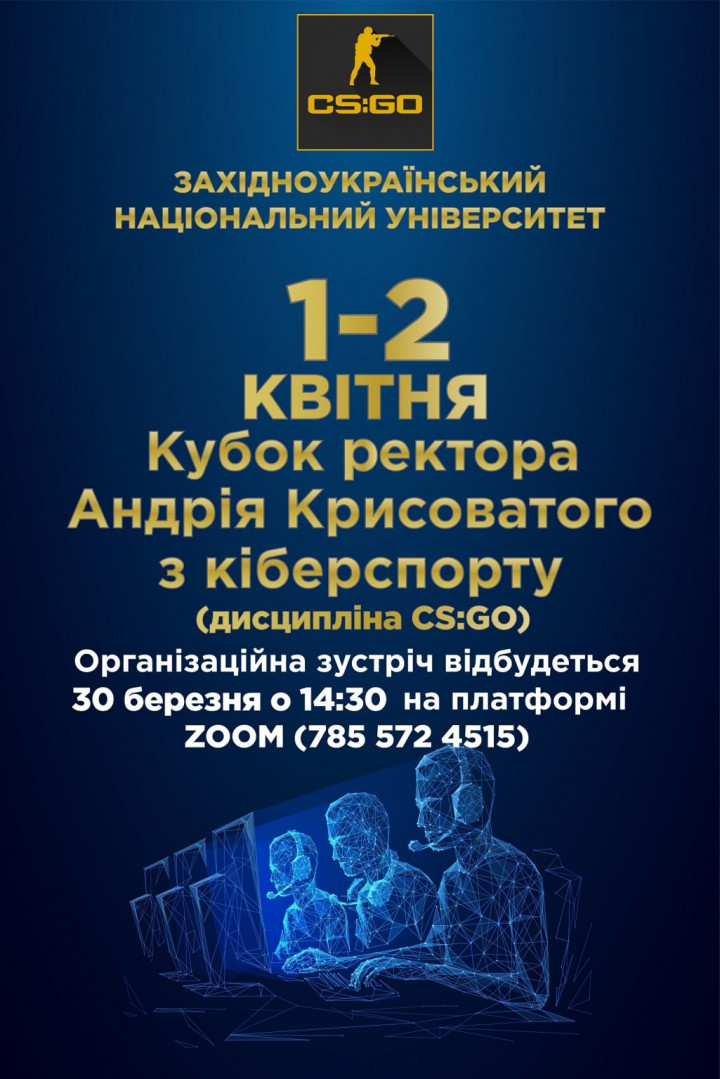 1-2 квітня 2021 року в Західноукраїнському національному університеті м.Тернопіль відбудеться Кубок ректора з кіберспорту (дисципліни CS:GO).