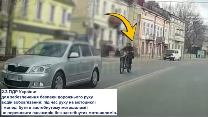 У суботу в центрі Тернополя патрульні поліцейські зупинили мотоцикл за порушення правил дорожнього руху – водій перевозив пасажира без мотошолома.