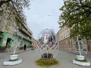 У центрі міста Заліщики встановили яскраві тематичні локації та фотозони: креативні писанки, великодній кошик, дерева та інші атрибути свята.