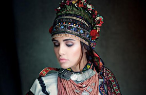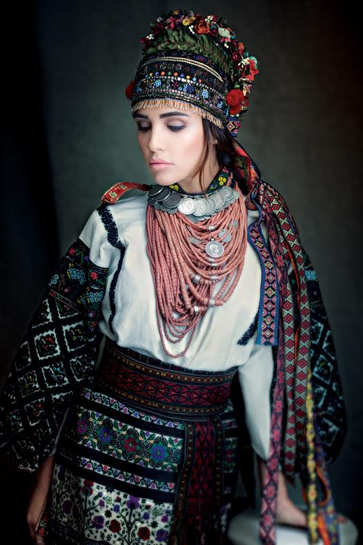 Санта Дімопулос вдягнена у вбрання Борщівського району (сучасної Тернопільської області), що на Західному Поділлі. Костюм початку ХХ століття.