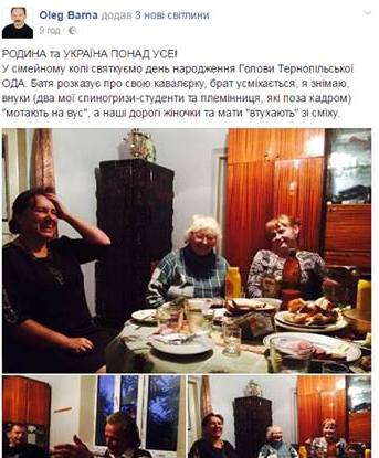 “РОДИНА та УКРАЇНА ПОНАД УСЕ! У сімейному колі святкуємо день народження Голови Тернопільської ОДА. Батя розказує про свою кавалєрку, брат усміхається, я знімаю, внуки (два мої спиногризи-студенти та племінниця, які поза кадром) “мотають на вус”, а наші дорогі жіночки та мати “втухають” зі сміху”, – написав Олег Барна.
