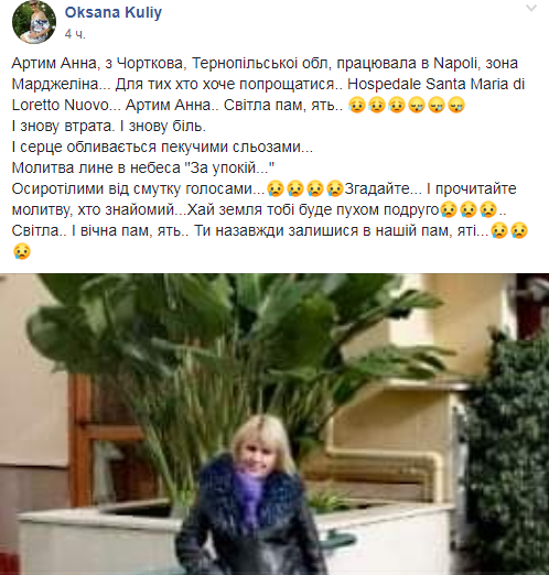 В Італії раптово померла Анна Артим. Жінка родом із Чорткова.
